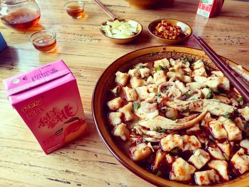咱蒲城人吃葫芦头都要喝个果汁,感觉这也是经典搭配!注意看碗里的鸡肉很大块有没有,辣子放的多多的红油红油的,隔屏码字都让小编直咽口水!