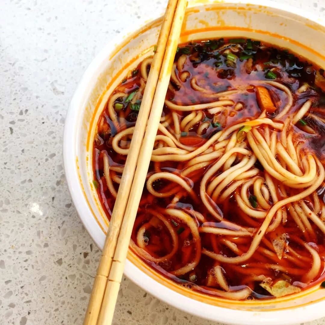 刚做好的面包装很好,顺时针拧开红盖子就行。呀!颜色味道都不错!!葱花、胡萝卜、土豆都有!酸酸辣辣,挺正宗的臊子面味儿。妞爱吃辣,觉得如果能放点调料在店里,自己调,就更好啦!