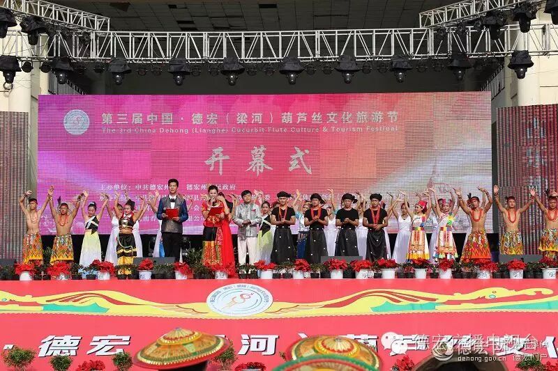 10月2日上午,梁河县民族文化广场变成了歌舞的世界,欢乐的海洋,第三届“中国·德宏(梁河)葫芦丝文化旅游节开幕式在此隆重举行,葫芦丝演奏大师、高手、名家云集这里。