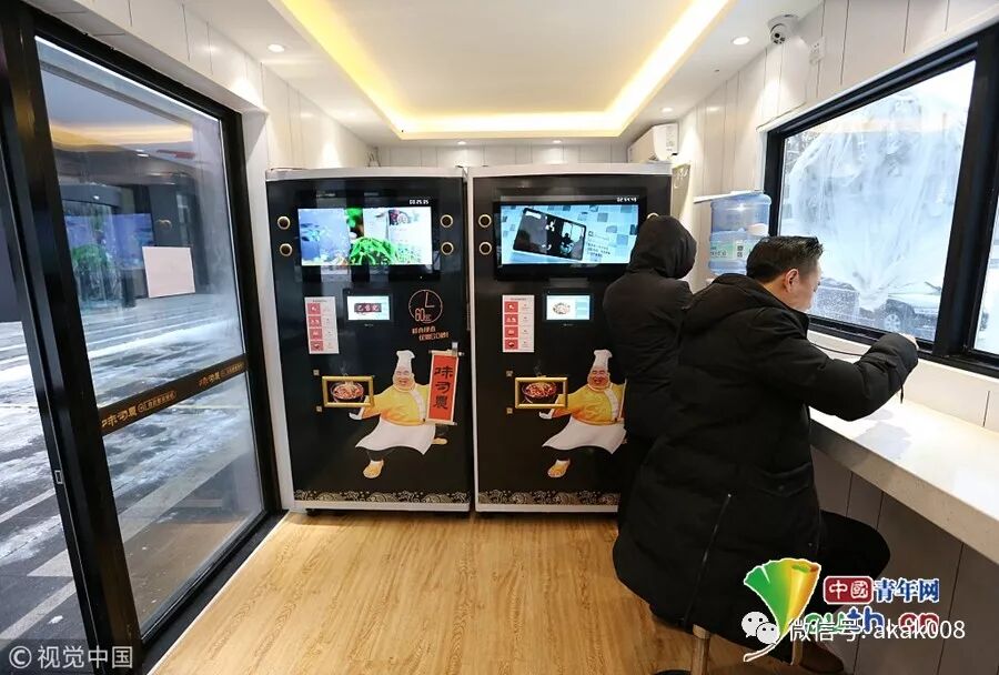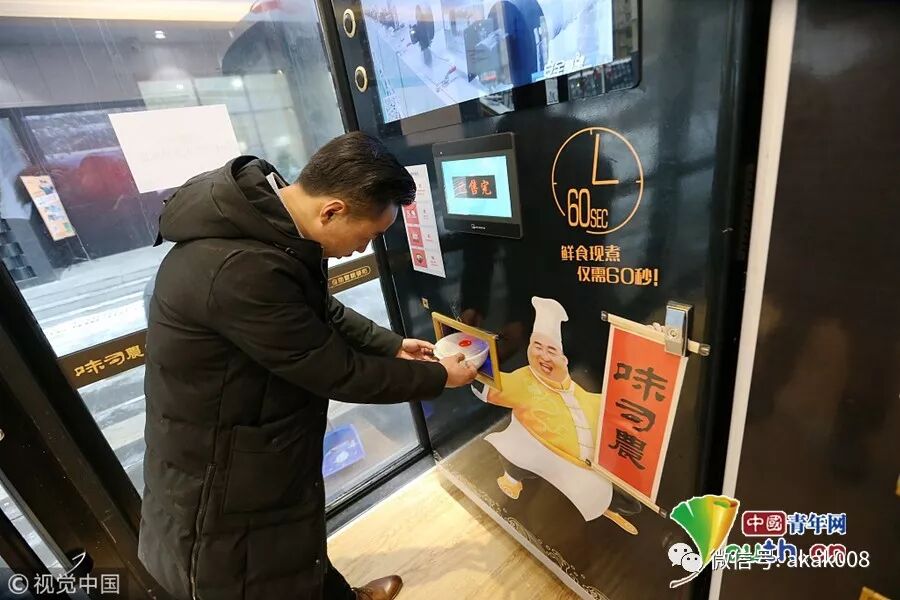 2018年1月4日,市民从机器中取出面条。在西安曲江创客大街上,一个集装箱大小的无人面馆矗立街边,该面馆没有厨师和服务员,民众可在机器上选择炸酱面或者臊子面、多辣或少辣,手机支付后一分钟,热面条就从机器中送出,前来品尝的市民络绎不绝。