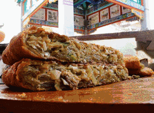 濮阳壮馍是河南濮阳著名的面食小吃,壮馍形如圆月,馅以鲜羊肉为主,以葱、姜、菜蔬、香油等多种祖传佐料搅拌而成。熟后的成品壮馍,色泽金黄,外焦内嫩,食之鲜而不膻,香而不腻。濮阳县的壮馍最好吃的是羊肉大葱的,趁热吃,那叫一个香!