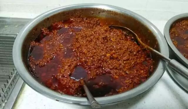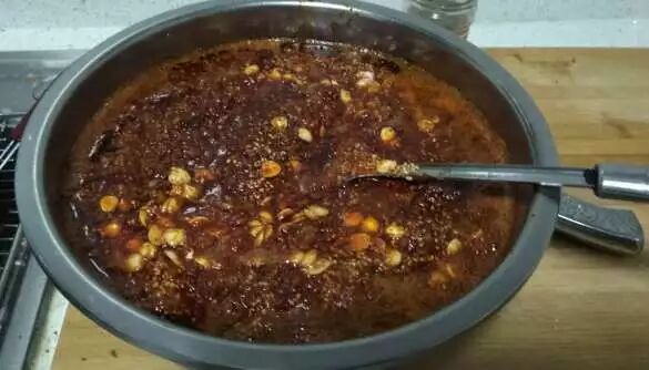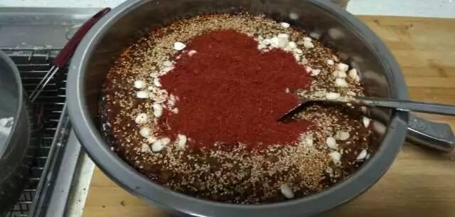 盆中倒入炒好的辣酱,再在上面撒辣椒面,白芝麻,杏仁等待油泼。