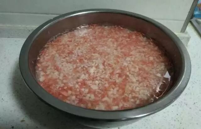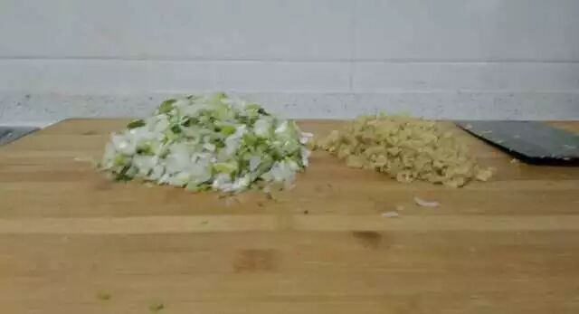 莲菜、红萝卜切丁泡水,多换几次水,去掉莲菜的淀粉,生姜大葱切碎备用。