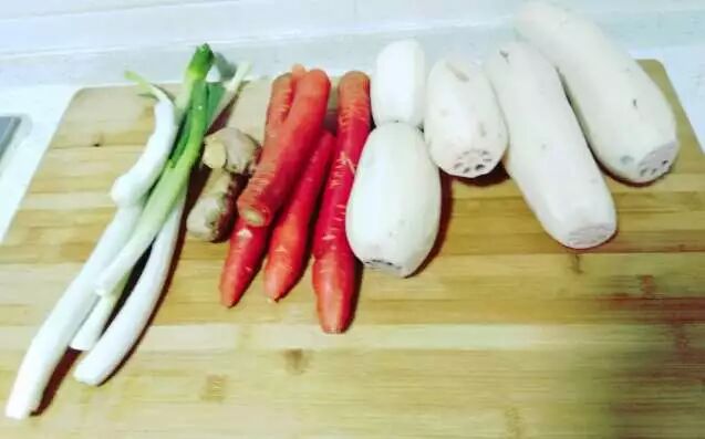 莲菜去皮洗净,红萝卜、大葱、生姜洗净备用