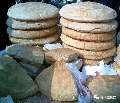 * 陕南的锅盔放在热锅上“摊”出来的,外面脆黄,里面柔软可口。直径60—70公分,像个小汽车轮子,就是越做越薄了,有的厚度都到2公分以下了。吃法倒是越来越多,除了直接吃外、切开夹豆腐乳辣椒酱、烧好的牛肉外,还被切小后下到火锅里或者像烤羊肉一样烤着吃等等。最正宗的羊肉泡馍就是要泡锅盔馍。