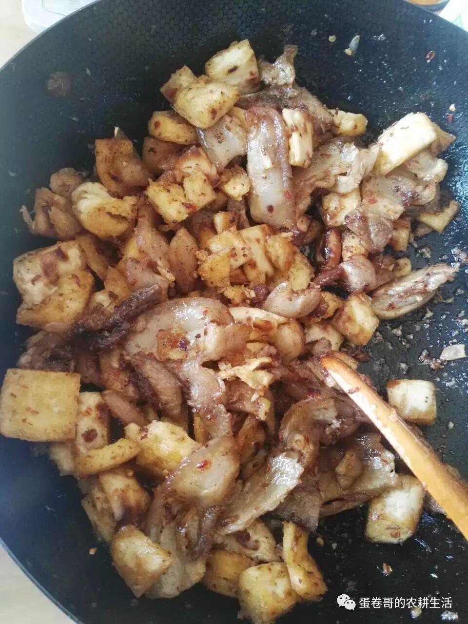 当五花肉还有三成肥的时候,把肉弄到一边,加入老抽,蒜末,姜丝,豆瓣酱炒,炒出红油,再将肉扒拉到锅中间炒一下,再加入馍馍一起炒,直到馍馍把油吸干。最后放盐,但是卷哥想啰嗦一句:一般豆瓣酱都很咸,所以为了家人健康着想,还是不要吃太咸了。