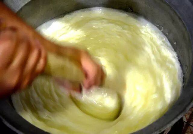 把沉淀好的淀粉,倒入微微冒泡的开水中后,就开始不停地搅拌。