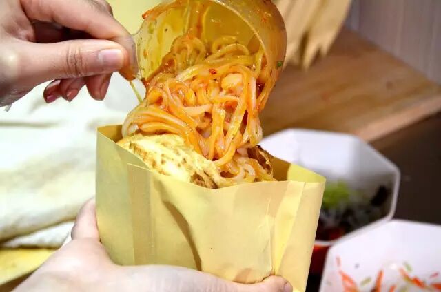只要招呼一声:“老板,来份锅魁夹凉粉,多辣椒。”