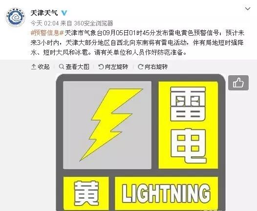 天津气象部门凌晨发布雷电黄色预警信号!