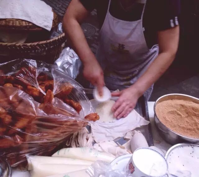 这家位于春森路的糯米团很受附近的居民喜爱,熟练的老板娘一分钟可以做出4个糯米团。先用饭勺从砧子里舀出适量的糯米,放在纱布上将其压平。随后,用勺子分别取少许糖与黄豆面均匀地铺在糯米上,再从一旁的油条袋里挑选两节炸成金黄酥脆的油条放于糯米中间。