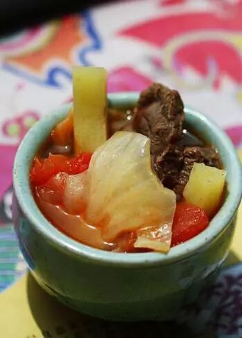 3、至牛肉快熟时,将番茄、卷心菜倒入炖至菜熟,加入精盐、味精,再略炖片刻即可