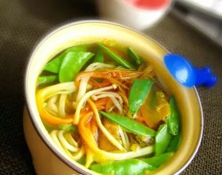 原料:南瓜、荷兰豆、金针菇、鸡高汤、水、盐。