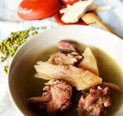 原料:老鸭、绿豆、土茯苓、姜、陈皮、盐