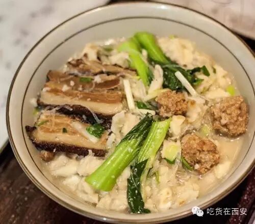 里面配料非常丰富,有响皮、丸子、五花肉、木耳等,馍煮好后,往上面盖上一层现炒的莲菜肉片,在西安有吃家把这东西叫做“猴戴帽”。