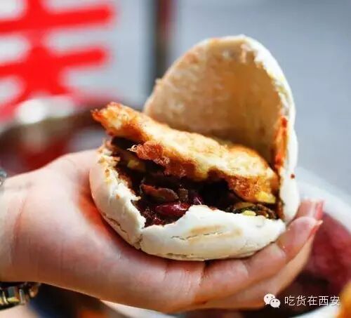 这个就是用饦饦馍夹着各类配料做成的。先抹上一层辣酱,然后铺一层咸菜,再夹上两三个咸鸭蛋黄,最后再洒上几粒酥脆的花生米,这样配合起来吃的夹馍吃起来很有层次感。