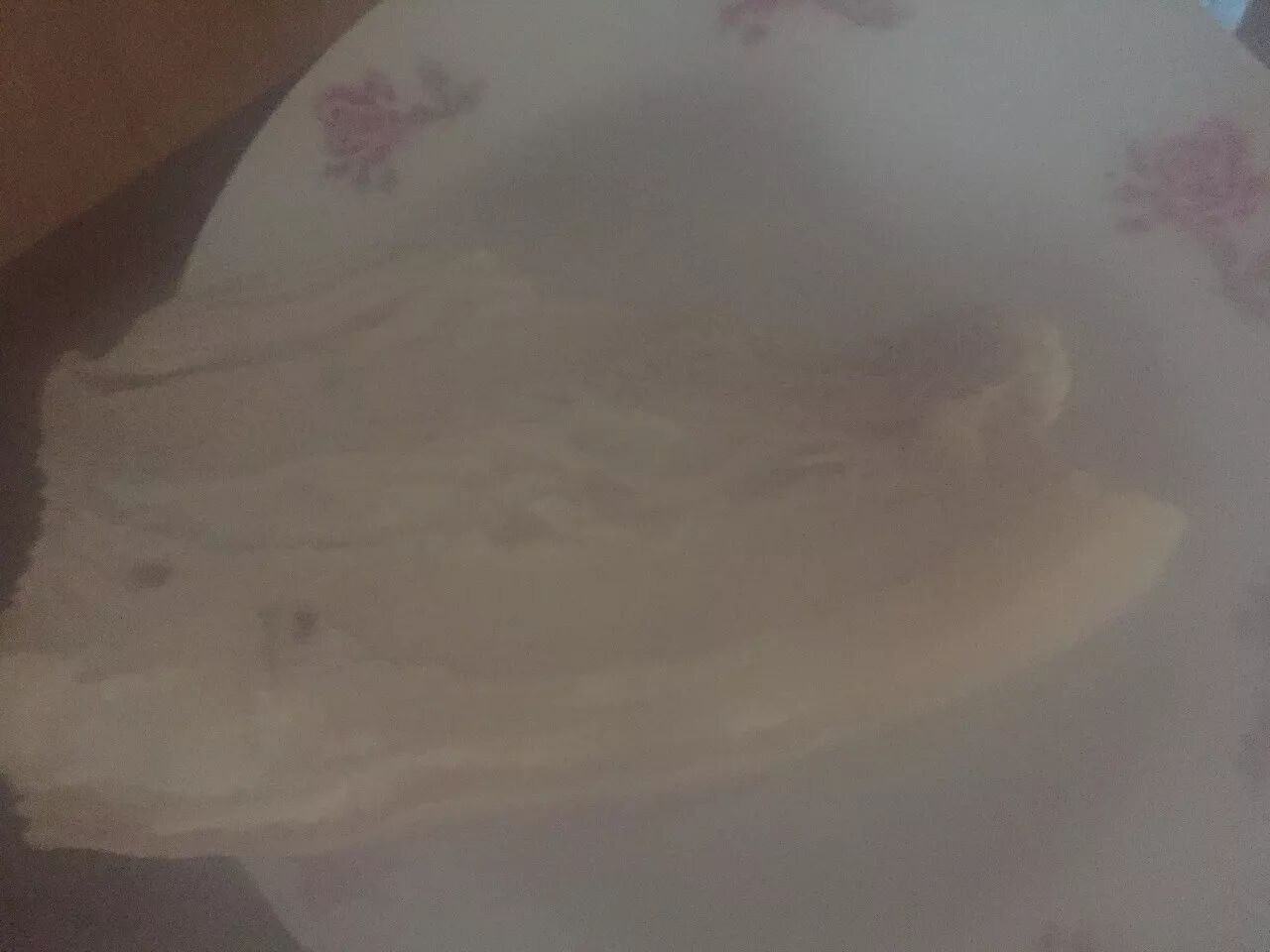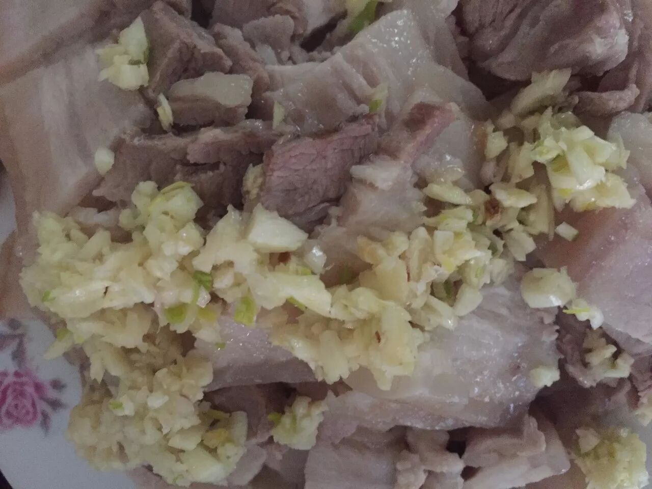3.把切好的猪肉放在盘中,在把蒜放在猪肉上