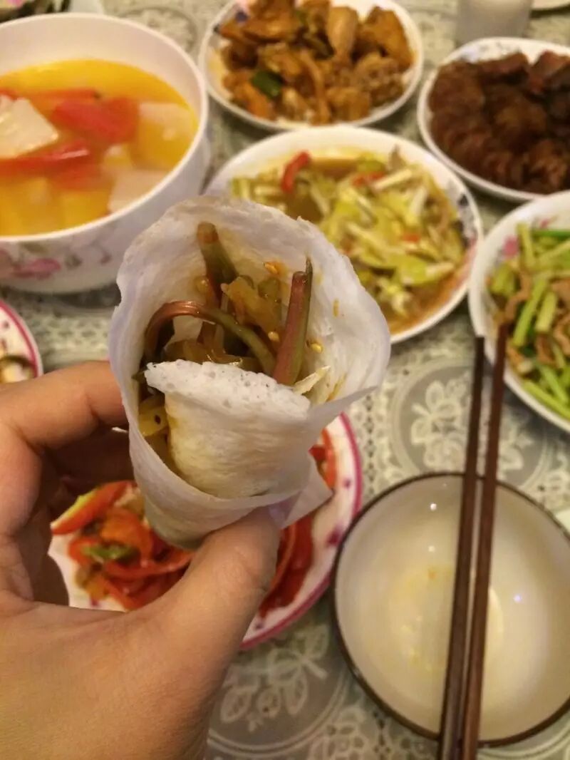 粉丝阳阳阳家的年夜饭,团长看了一眼就被吸引了。不是大鱼大肉,不是生猛海鲜,却是一盘不起眼的 春 卷 皮 。