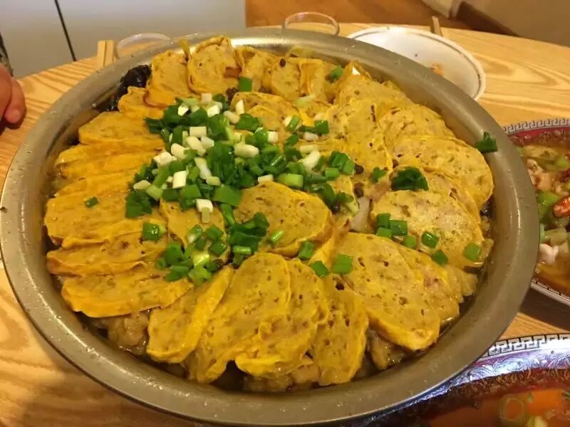 香 碗,也叫耙耙肉,很多地方的年夜饭上都有它。蛋卷裹上肉上锅蒸,然后切成一片一片,下面垫上蔬菜。只要在饭桌上看到了这道菜,必逢佳节。