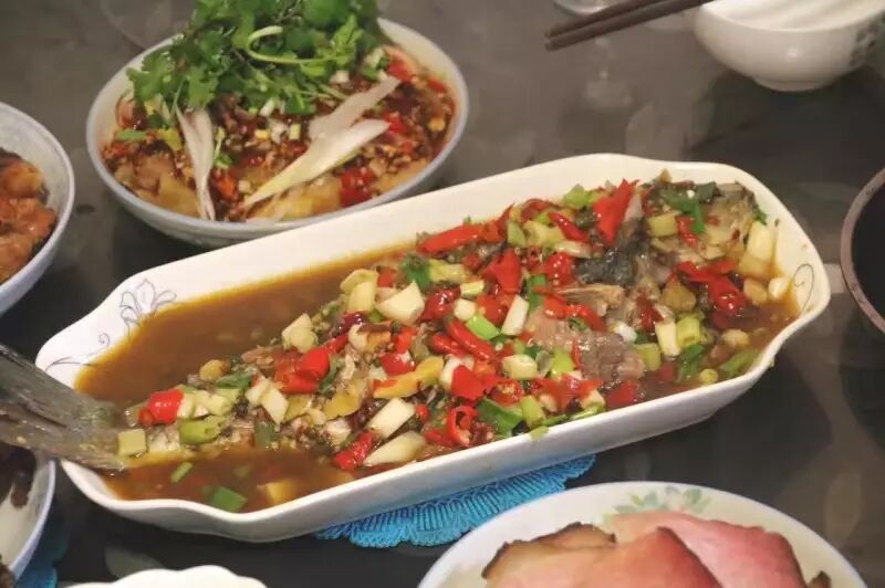 鱼 是年夜饭上必不可少的菜,寓意年年有余,在新年能讨个好彩头。清蒸之后浇上用辣椒、大葱、泡椒爆炒出来的盖头,四川人的鱼就是这么有料。