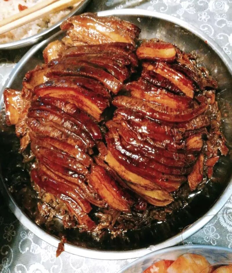 han 烧 白 是萱萱家年夜饭上必不可少的一道菜。半肥半瘦的五花肉切得只拽实,肥肉一抿就烂,肥而不腻。下面垫了有盐有味的下饭芽菜,简直一片接一片根本停不下来。