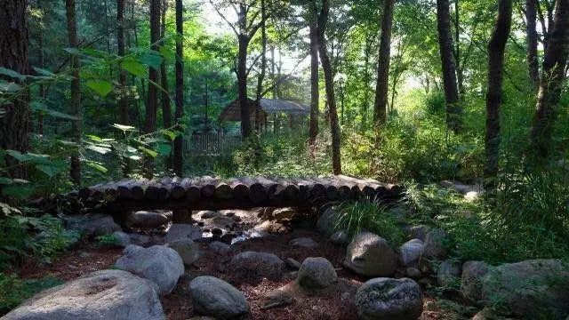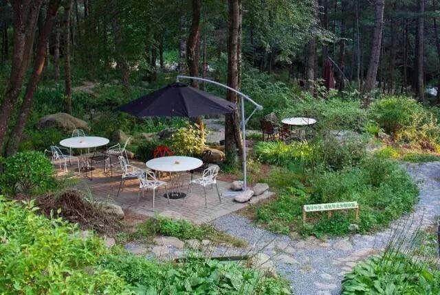 穿过前庭,走到后院,树木葱绿,野花遍开,溪水潺潺,一派绿水青山的景象,曲径通幽的林间小路给人无限的遐想,设计师的独具匠心,模糊松林里的庭院边缘,让游人迷醉在每一次呼吸里。