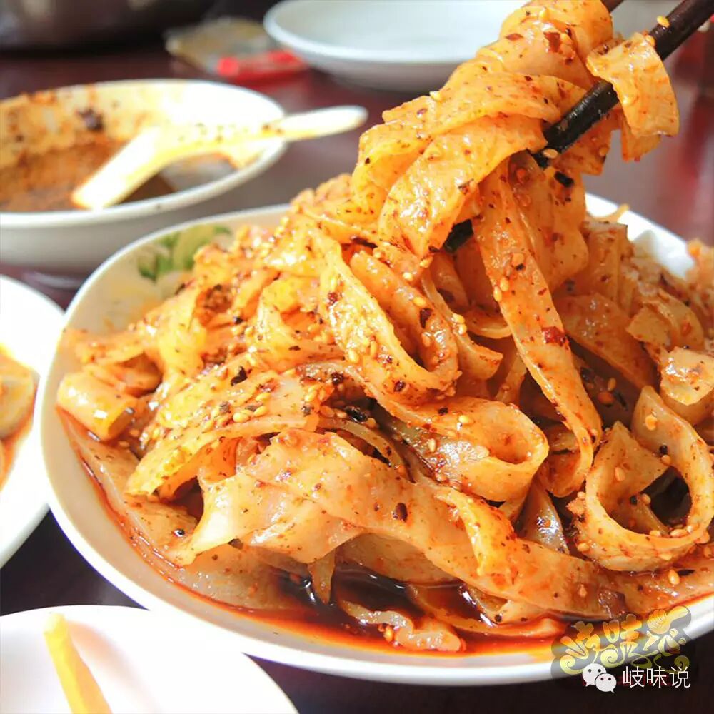 擀面皮是陕西地区特有的汉族名小吃,尤以西府宝鸡地区为最佳,宝鸡岐山擀面皮2011年被认定为中华名小吃。