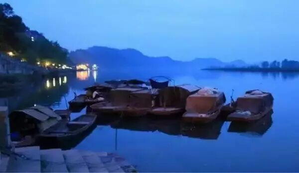 黄昏的下河街,凭栏可观水流平缓的嘉陵江,江上有篷船,还有摇桨的人影。