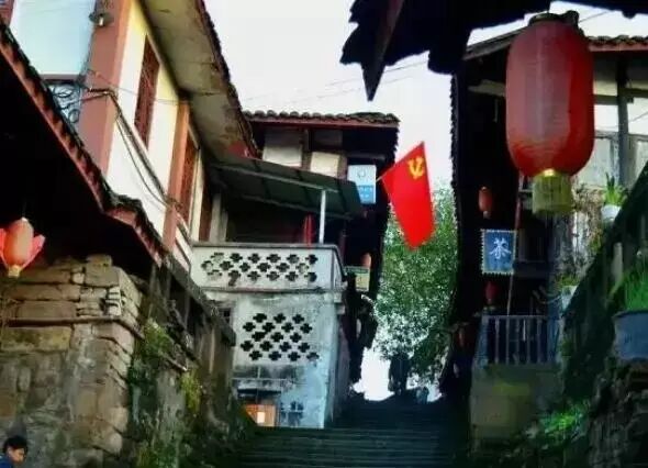 老街从河畔向东高起,缓缓的坡道铺上石板,约3米宽,有窄窄的街沿,平房、二层楼的临街建筑均为穿斗瓦顶。
