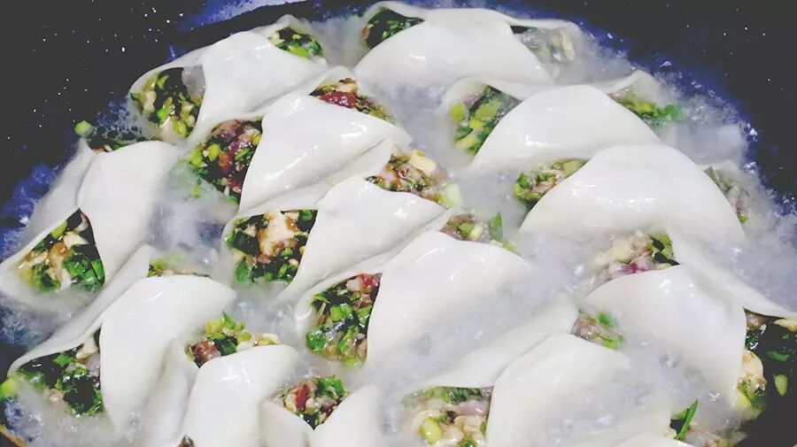6, 约3分钟,煎到锅贴底部金黄,放半碗水,水量没过锅贴一半, 盖上锅盖。听到哧哧拉拉的声音了,开盖,把锅贴翻面,再加两勺水,再水煎一次,听到哧哧拉拉的声音,锅贴就熟了。