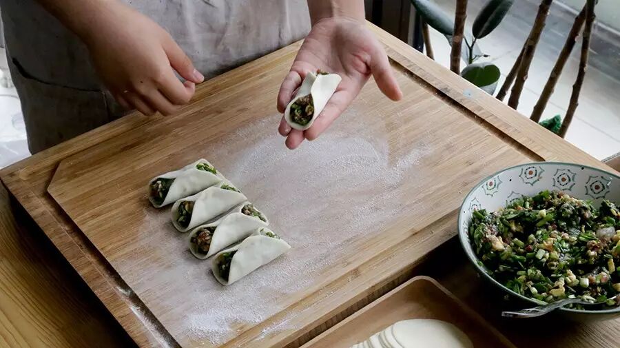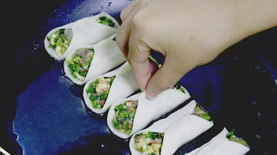 4, 中间捏紧,两头露着,一个锅贴就包好啦,是不是比饺子容易很多呀。