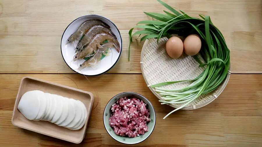 1, 鸡蛋炒熟成碎,韭菜切成细末,虾可以切大块一点,吃起来会比较幸福。