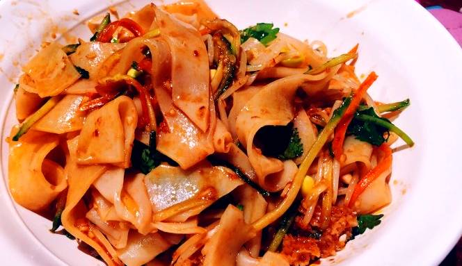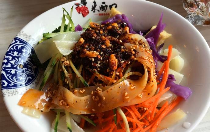 这家的青海凉皮特色之处就在于毫不惊艳的外表下要用香浓的味道,面皮比一般的要宽,叫起来也更有口感,配料有香菜、紫包菜丝和黄瓜丝,清淡的口味细嚼之下满满的花生香味,颇有一番藏族生活的意味。