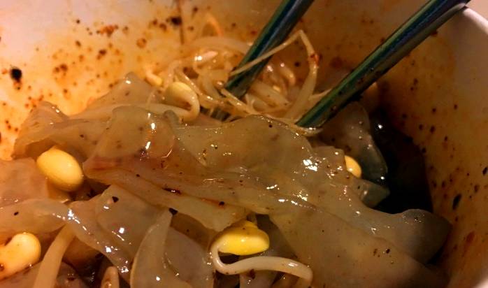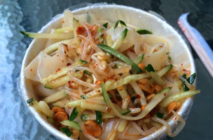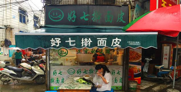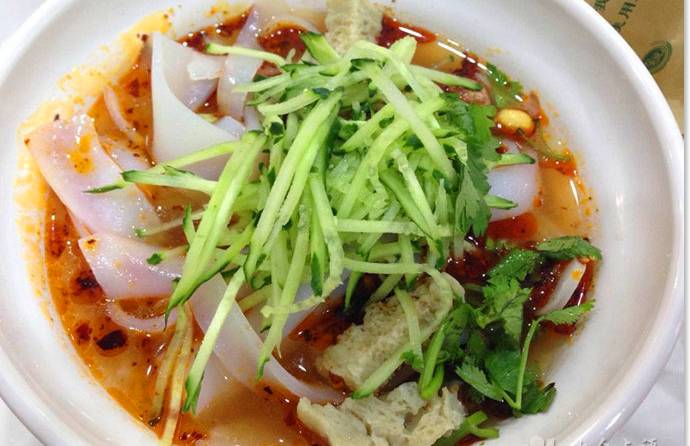 合肥有很多家赵征擀面皮,有的是有正规的店面,有的推着小推车,在凉皮米线界的名气仅次于周贵妃。简单的凉皮、米线、黄瓜丝、花生粒儿,最主要的味道来自于汤中,酸酸辣辣的汤拌着凉皮吃,味道好吃辣味也不刺激。
