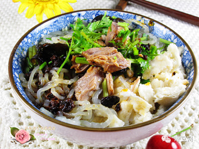 12)将粉丝、木耳、汤汁倒入碗中,加入羊肉、香菜和香辣豆豉酱即可。