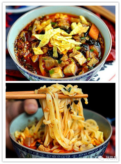 岐山臊子面:臊子面讲究薄、筋、光,汤讲究酸、辣、香,配菜非常丰富,再配上肉臊子,荤素皆有,汤上漂着鸡蛋饼切成的小片和韭菜碎,想想就流口水!!