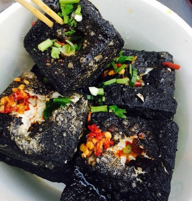 一块块黑色的小豆腐味道一点都不臭,吃起来香脆可口,足足的汤汁包在里面,辣椒的量也是刚刚好,吃臭豆腐也是有技巧的:先在上面戳几个小洞,把酱和汁倒进去再吃,一口烫烫的臭豆腐吃下去,有一种酣畅淋漓的快感!
