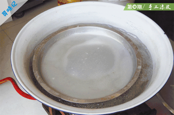 舀一勺面糊放入蒸凉皮的模具中,入锅前摇晃一下,这样蒸出来的面皮厚度才均匀。