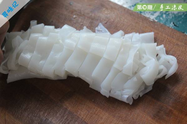 将面皮卷起放在砧板上,用刀切成宽度1.5厘米的长条,放入搅拌盆里,依次加入蔬菜、花生、面筋、调料、汤汁等,再用筷子搅拌均匀,一碗陕西凉皮便制作而成。