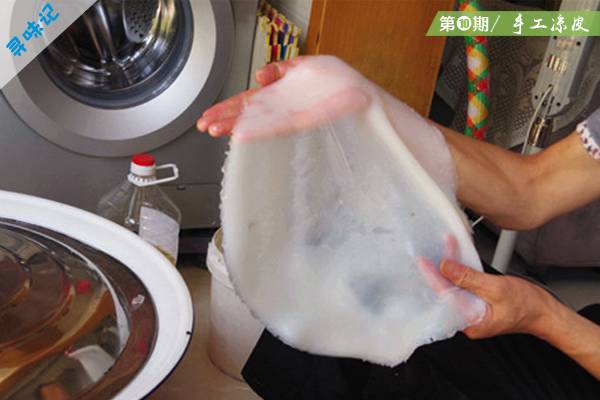陕西凉皮作为一种历史悠久的传统小吃,手工工艺得以流传至今实在难得。年轻时,龙大叔跟陕西人学习制作陕西凉皮。龙大叔家的凉皮是纯手工制作,因此耗费的时间成本巨大。除了凉皮用到的汤汁需要熬制4个多小时外,从洗面粉到做面皮,还要花上9、10个小时。一袋50斤的面粉,混合大量的水,花两个多小时不停地揉搓,直到洗出面筋。洗出的面筋还需要进一步处理,剩下的面糊则用来制作面皮。