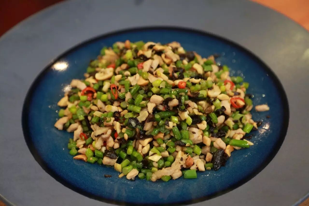 3.木耳、青椒、蒜薹、生抽、盐、花生碎翻炒入味出锅。