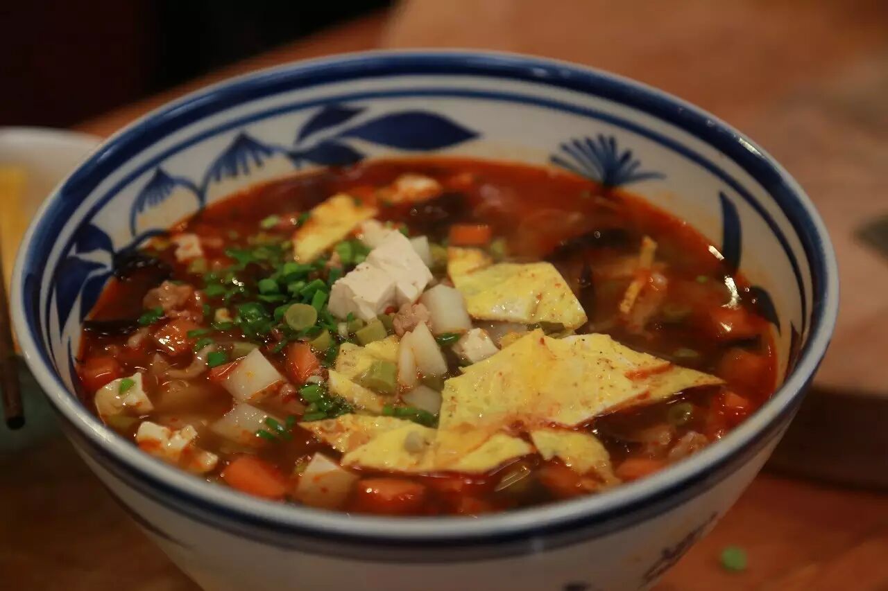 5. 将细的手擀面下入锅中煮熟后盛到碗中,浇上带素臊子的臊子汤,面上放上“漂菜”(漂菜为摊好的鸡蛋饼块和韭菜末)即可品尝。