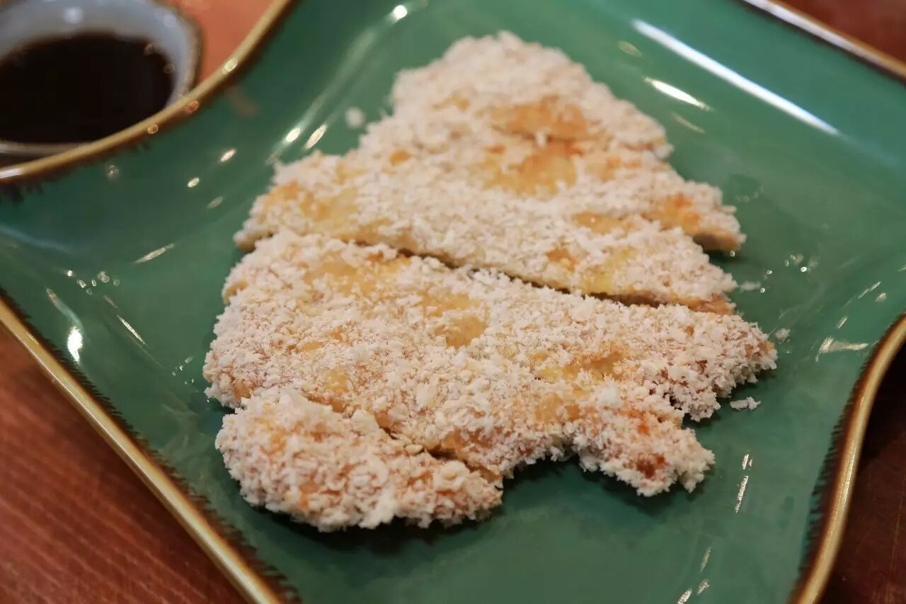 3.再将猪排裹一成面粉,反复三次,再裹一层面包糠;