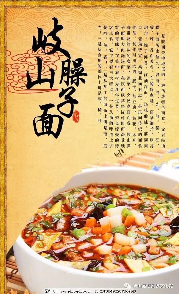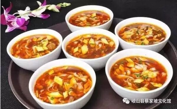 岐山臊子面即大肉浇汤面,在陕西以其经济可回而深受顾客的青睐,在关中农村为逢年过节、婚丧嫁娶的待客主食。它主要有三大特点,一是从汤的味道上讲是酸、辣、香;二是从加工的面条上讲是薄、筋光;三是从食用的整体上讲是煎、稀、旺。