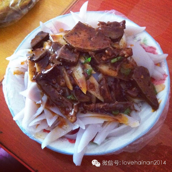 碗托,像碗形状一般,切成一小片小片的,上面淋了猪肝煮出来的酱料,味稍咸,但猪肝够味易入口