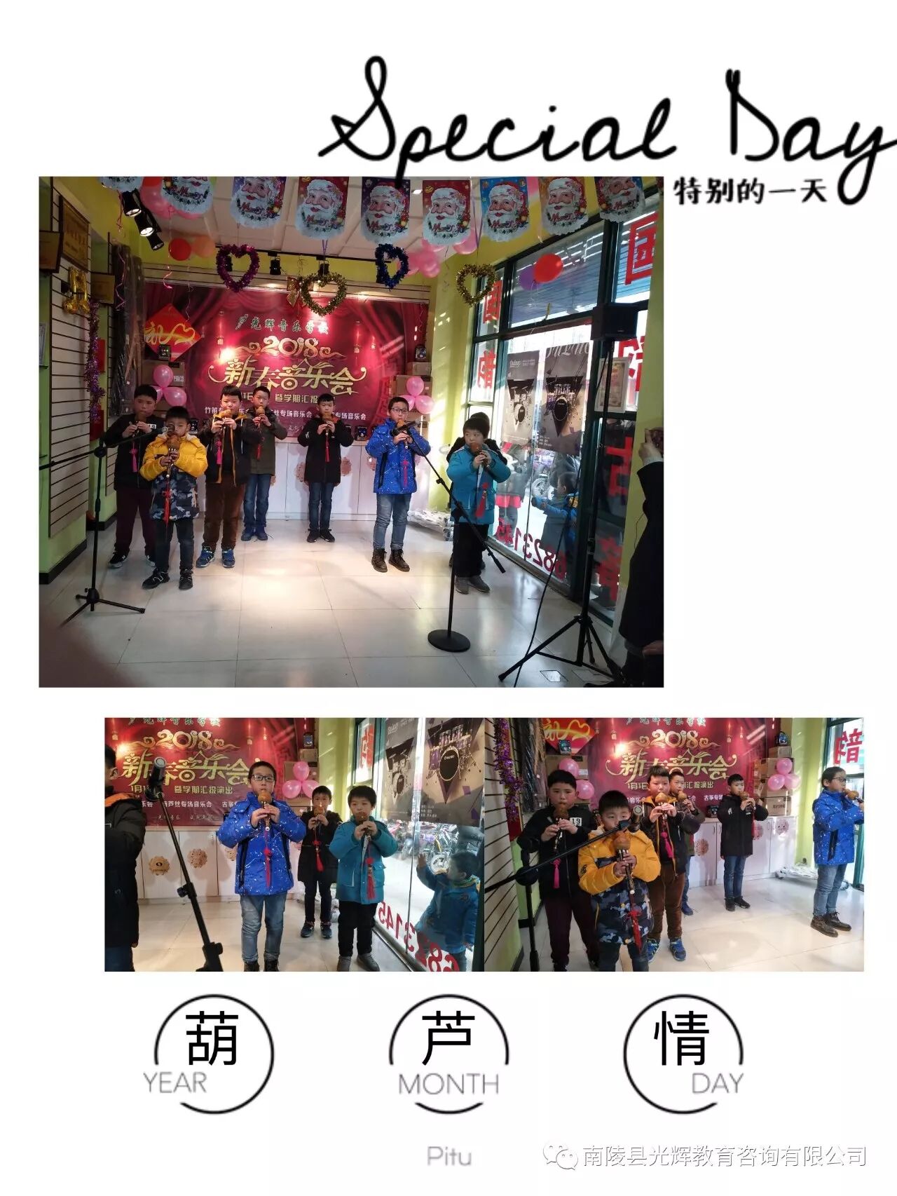 南陵县光辉音乐学校2018新年音乐会暨学期汇报演出系列活动到此画上圆满句号了!本次系列音乐会一共有八场,其中包括:声乐师生演唱会、小提琴师生音乐会、钢琴师生专场音乐会、吉他架子鼓师生音乐会、电子琴长笛音乐会,古筝师生专场音乐会、竹笛师生专场音乐会和葫芦丝师生专场音乐会。在全校师生的共同努力下新年音乐会系列活动圆满举行!