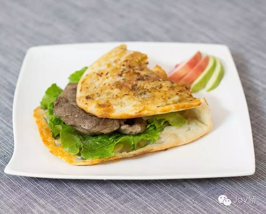 将牛肉横切成厚片,入生抽和盐腌制一刻钟后。平底锅加入适量油,小火煎至牛排变色就ok啦。夹入锅盔中,撒上黑胡椒粉。