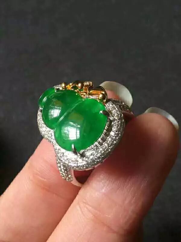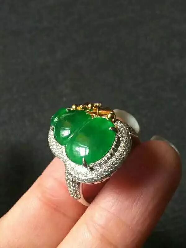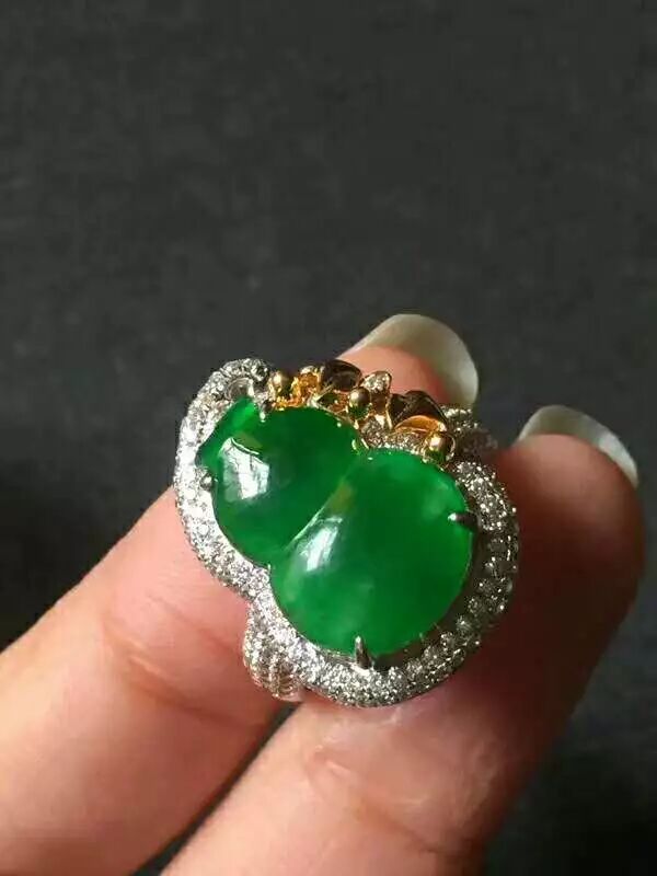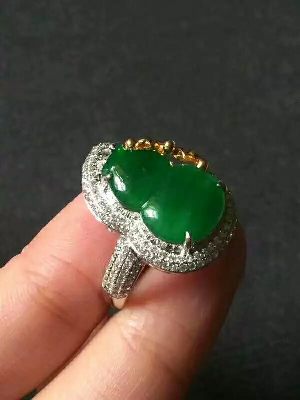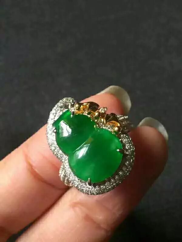 辣色艳阳绿大葫芦近帝 王绿冰种帝 王绿艳阳绿,完 美无瑕,千万别错过,种色很好,起光水润起胶感,裸石15.5:11:3mm,18K重金大钻,整体形态非常美,简单大方,不解释。