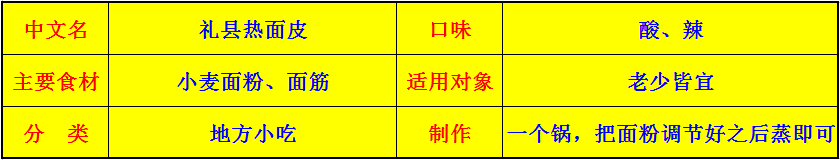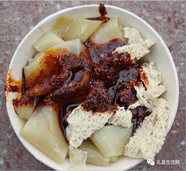 热面皮爽滑筋道,辣味十足,为礼县最具特色的小吃之一。
