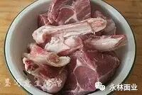 2.将羊肉切成2~3大块,将羊腿骨从中间剁开露出里面的骨髓