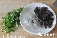 15.将粉丝用凉水泡软、木耳泡好撕成小朵,香菜切成小段、葱切成葱花、最好再放点切成末的青蒜苗
